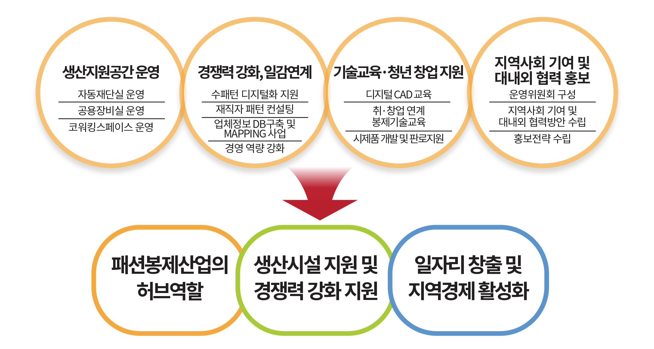 현재는 실 등 원부자재 공동구매를 통한 비용절감, 조합원들에 대한 문자서비스를 통한 일감 및 구인·구직 연계 등의 사업을 진행하고 있으나, 앞으로 외국 패스트패션(SPA)의 수입 급증에 따른 국내 의류시장의 위기에 대응, 우수한 봉제기술(경력 15년 이상)을 보유한 조합원들로 구성되어 있는 조합의 강점을 살려 자체 브랜드를 개발하여 직접 판매함으로써 유통마진 절감, 양질의 의류를 적정가격에 공급하여 생산자와 소비자가 함께 윈-윈할 수 있는 시스템을 구축하려고 하고 있습니다.