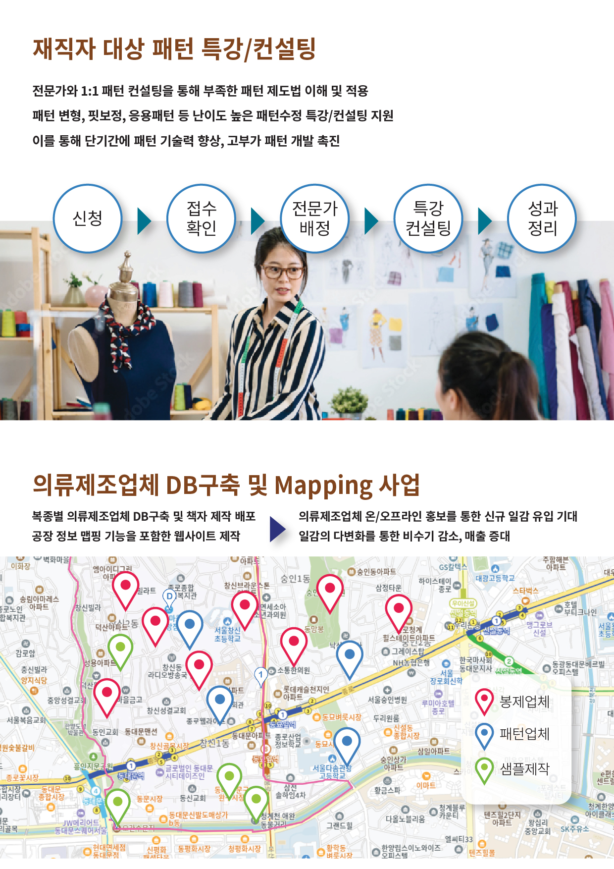 수패턴 디지털화 지원, 재직자 대상 패턴 특강/컨설팅, 의류제조업체 DB구축 및 Mappping 사업